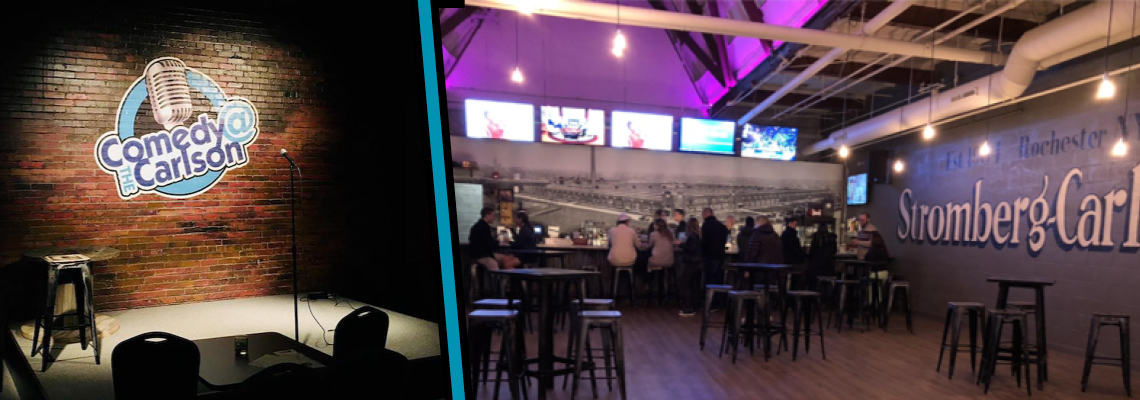 Comedy @ The Carlson features a 350-seat showroom that hosts the nation’s best entertainers weekly. Alongside our main showroom is a beautifully renovated atrium bar, which contains many nods to our building’s rich history.Formerly a factory and warehouse for The Stromberg-Carlson company, we’ve embraced our heritage and designed our atrium bar to remind everybody who visits us just how important our building is to the history of audio equipment, specifically the microphone. If you’ve ever seen a picture of Frank Sinatra from the 1950s or remember the famous Elvis Presley stamp, you’ve seen a Stromberg-Carlson microphone. Now, whenever you look at our logo or the mural behind our stainless steel topped bar, you’ll see a nearly forgotten piece of Rochester’s past brought back to the forefront.